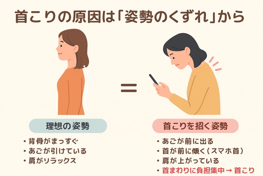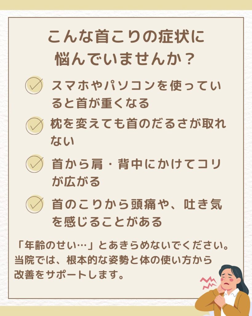 首こりは、首そのものに原因があるだけではなく、姿勢や体の使い方のクセによって負担がかかっているケースが多く見られます。