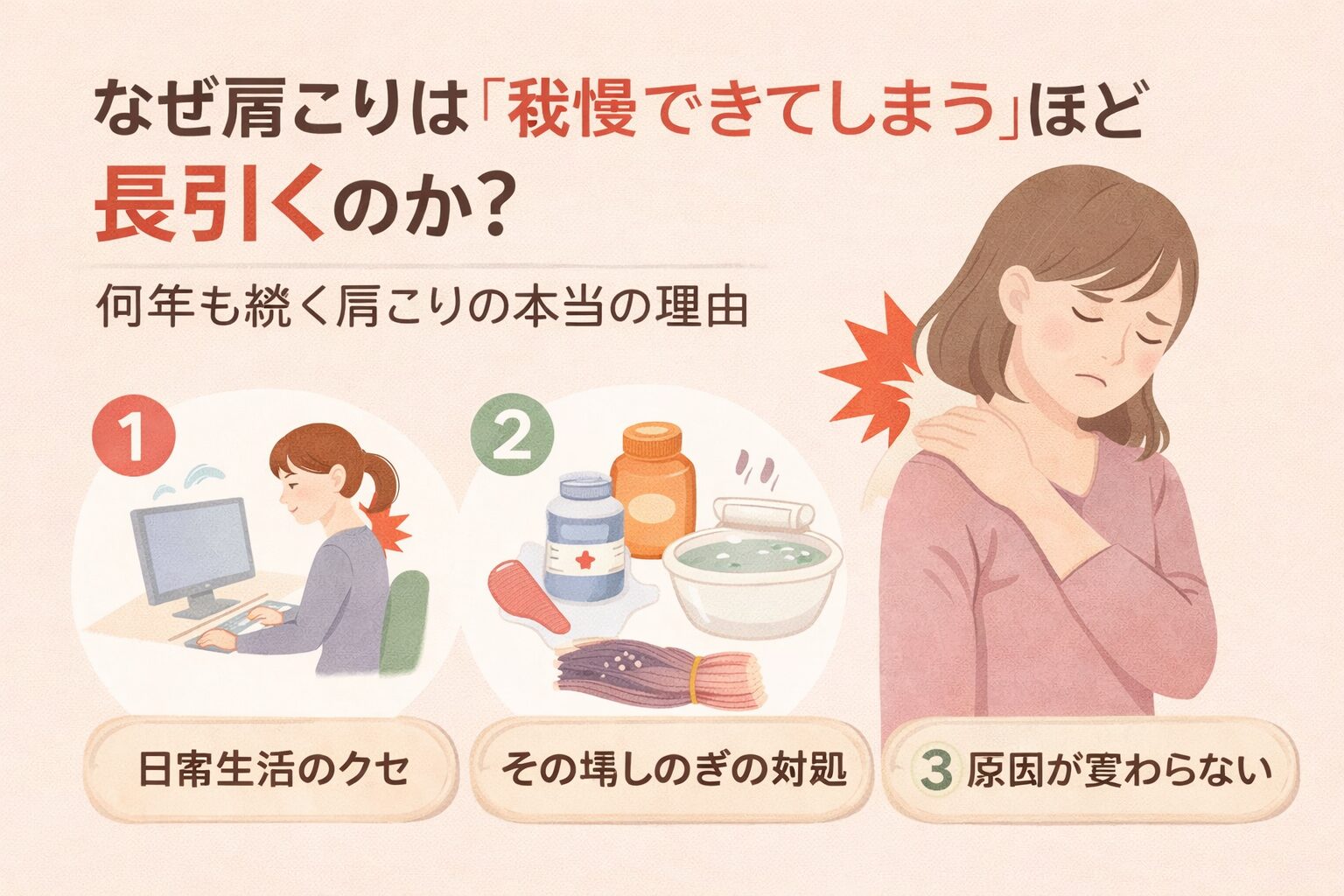 この記事では、なぜ肩こりが慢性化しやすいのかを、体の仕組みと日常生活の視点から解説します。