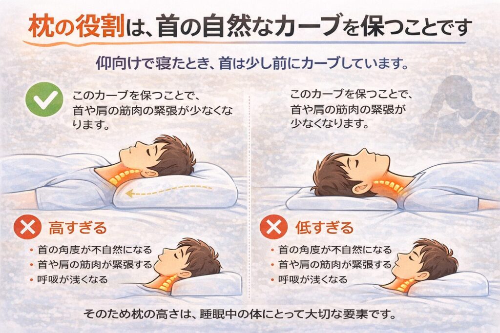 実際、枕の高さや形は睡眠中の首や肩の状態に影響します。
