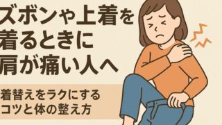 肩の痛みと対策 ズボンや上着を着るときに肩が痛い人へ|着替えをラクにするコツと体の整え方 ズボンや上着を着る動作で肩が痛む方へ。原因となる体の動きの制限やクセを解説し、着替えをラクにする服の工夫や、自分でできる肩まわりのケア方法を紹介します。 2025.11.04 肩の痛みと対策